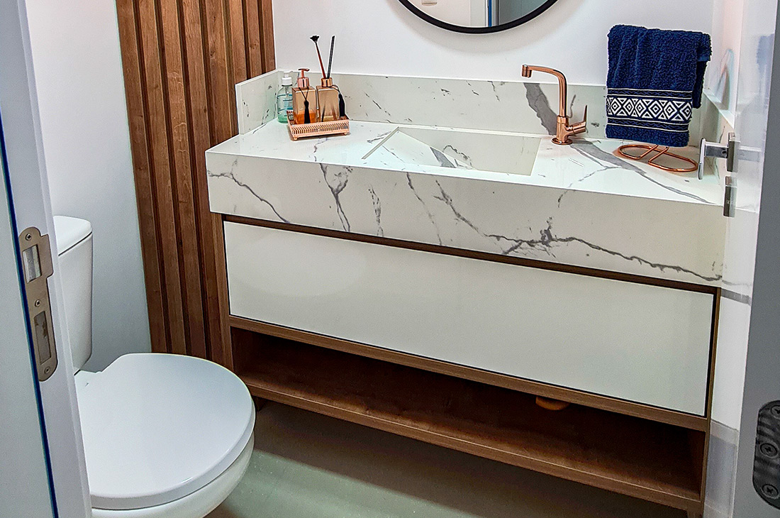 Banheiro funcional e confortável. Essas são as palavras que o definem. Com seu devido planejamento, cada detalhe foi pensando com carinho e atenção, trazendo assim a um banheiro simples, estética e muito conforto!