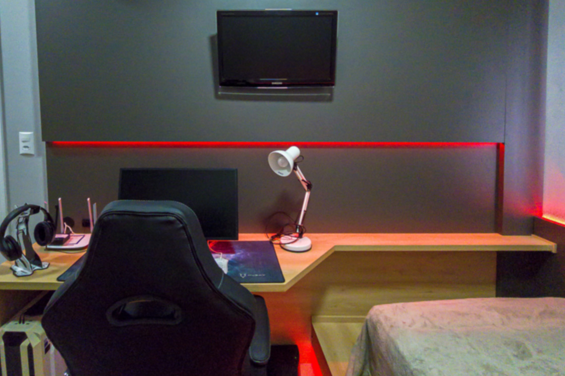Projetos de quarto gamer, é um pedido que vem se tornando cada vez mais frequente no dia, neste exemplo trabalhamos com as adaptações necessárias do computador do cliente e um jogo de iluminação divertida para dar ainda mais acabamento.