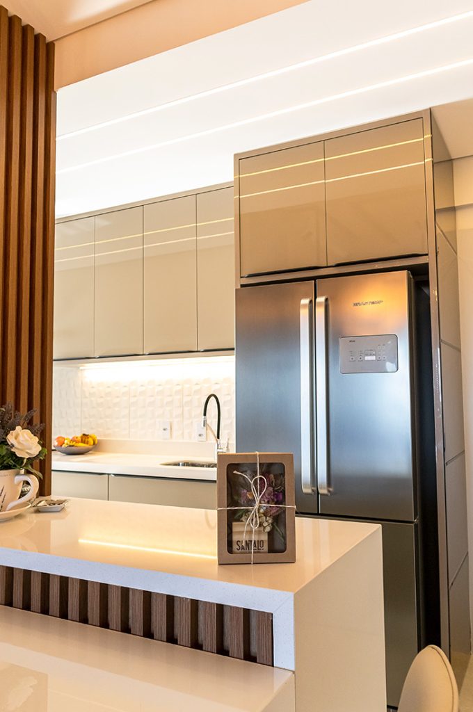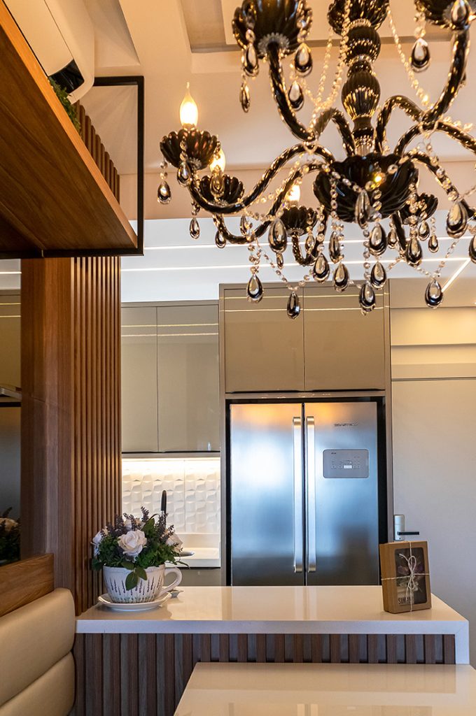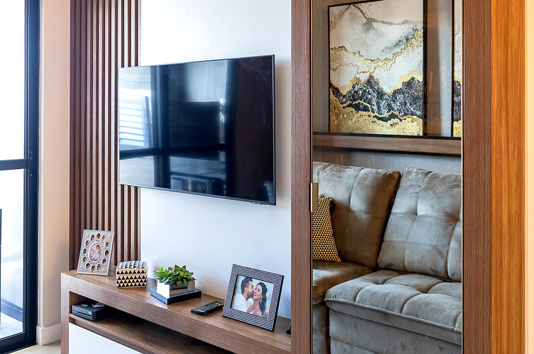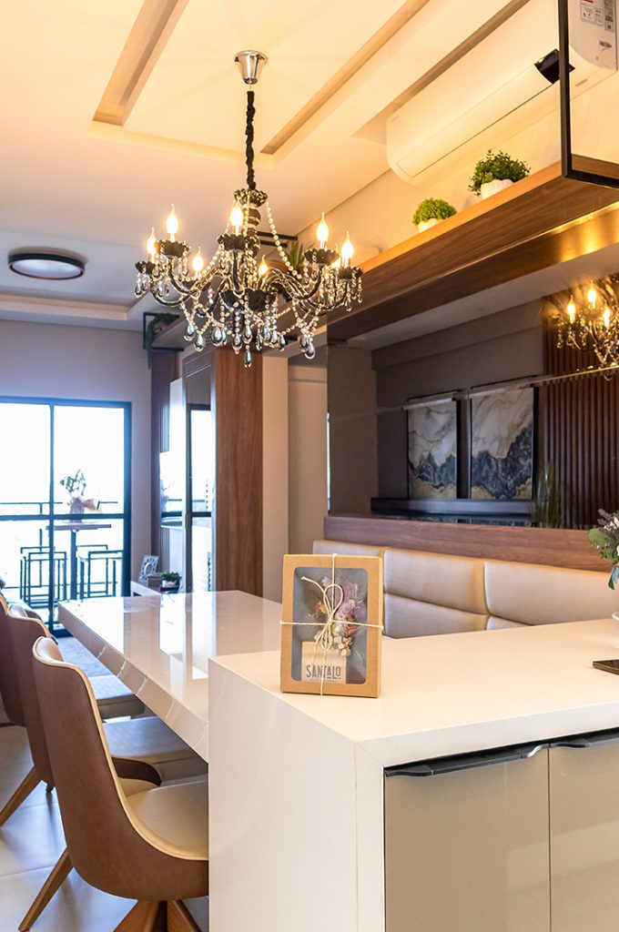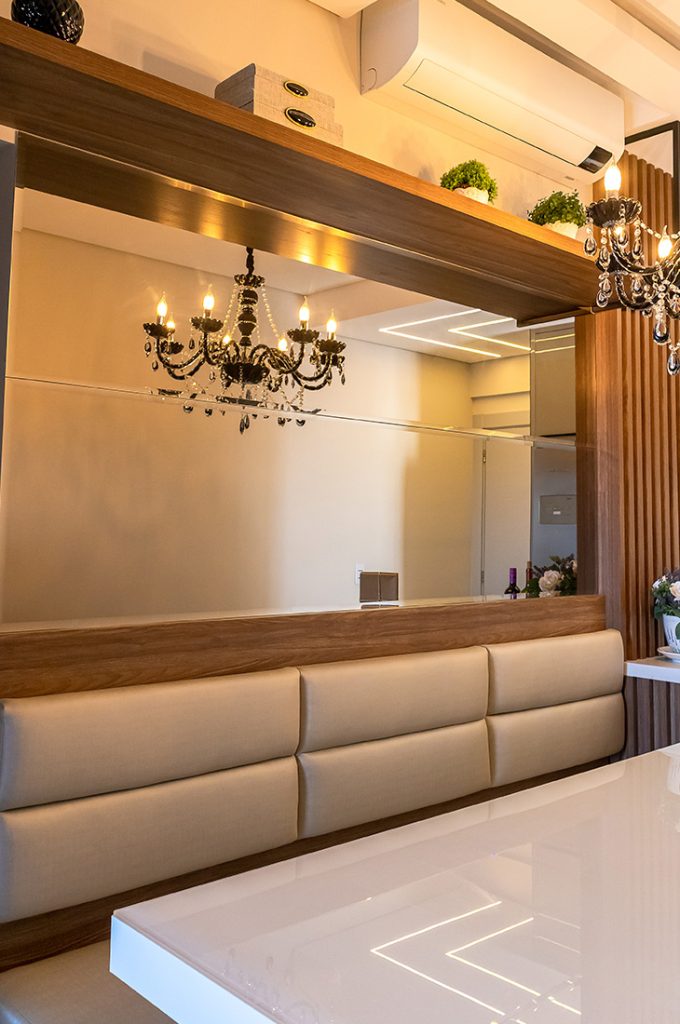 Neste living tivemos um grande desafio, pois tivemos que por a cozinha, um modelo de canto alemão que era a vontade do cliente e o home, o que nos deu uma redução de espaço, mas com um bom planejamento o resultado foi este. Sofisticado, leve e totalmente integrado e inteligente.