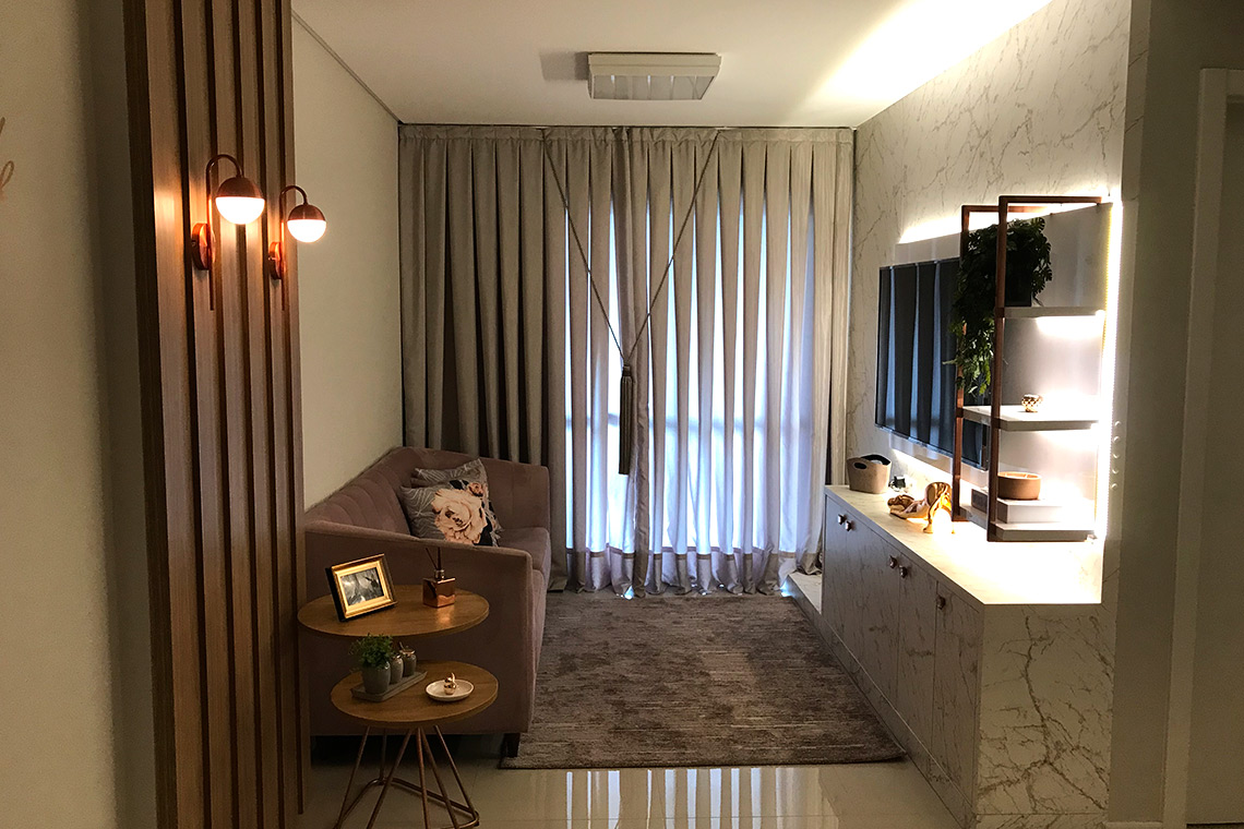 Contemporâneo é a palavra que define esse projeto. Apostamos em uma textura de MDF marmorizada, muita iluminação direcionada, metalon e sofisticação, uma combinação que deu super certo! Além de um paço inteligente para plantas na lateral do móvel para trazer ao ambiente um aspecto ainda mais confortável.